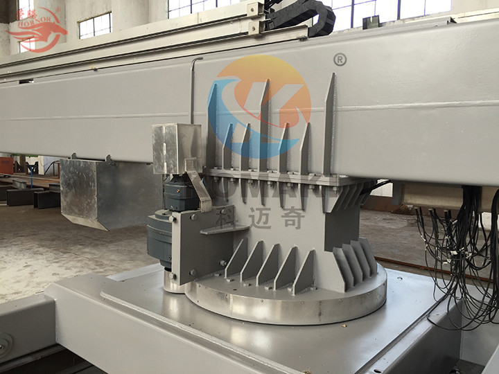 軌道式擦窗機的整個機構(gòu)安裝在一個能在水平軌道上行走的底盤上,靠行走底盤的運動來完成整個擦窗機的水平運行。這種形式的擦窗機一般安裝于坡度不大的屋面上,與建筑物相對獨立且安全系數(shù)高。由于擦窗機的起升、回轉(zhuǎn)、卷揚等機構(gòu)靈活多樣,所以軌道式擦窗機能滿足大部分建筑物的要求,只要建筑物屋面預留出足夠的空間和允許荷載,其臂長可以從幾米到幾十米,因配重隨著臂的增長而增加,整機重量也由2~3噸至幾十噸不等,因此在建筑結(jié)構(gòu)設計時就須考慮擦窗機的集中荷載對屋面結(jié)構(gòu)的影響,增加必要的承重梁柱等結(jié)構(gòu),以滿足安裝擦窗機的必要條件。